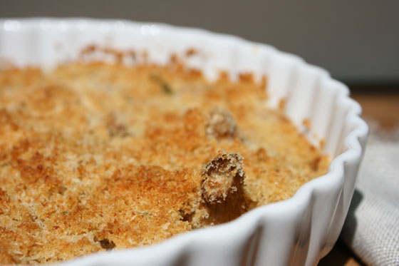 Top the mushrooms with the breadcrumb mixture and lightly sprinkle with some water until lightly moist. This will prevent the topping from drying out too much, leaving the breadcrumbs beautifully golden.