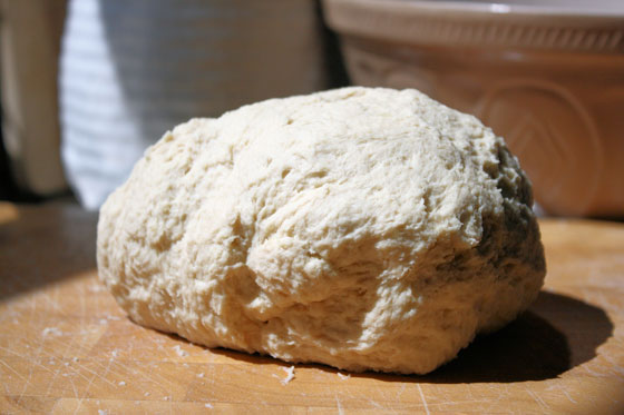 A quick technique to knead the dough is to stretch it flat in front of you with the heels of your hand; hold one end of the ball of dough with the heel of one hand while you use the heel of the other hand to stretch out the dough away from you.