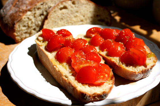 If someone woke me up in the middle of the night to tell me that there are some fragrant slices of bread with cherry tomatoes, extra-virgin olive oil, salt and a pinch of oregano waiting for me, I would jump out of the bed. That’s how much I love it. Nothing more to be said.