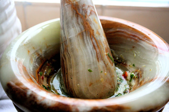 Add the sliced garlic clove, the chopped chilli pepper, the basil leaves, the juice of ½ lemon, the extra-virgin olive oil and a good pinch of salt to the mortar.