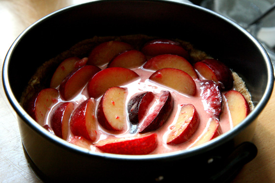 Arrange the plums in the tin to form a rose pattern, beginning at the outside and working your way in. Spoon over them their own juice and sprinkle the rest of the crumb mixture evenly over the plums.